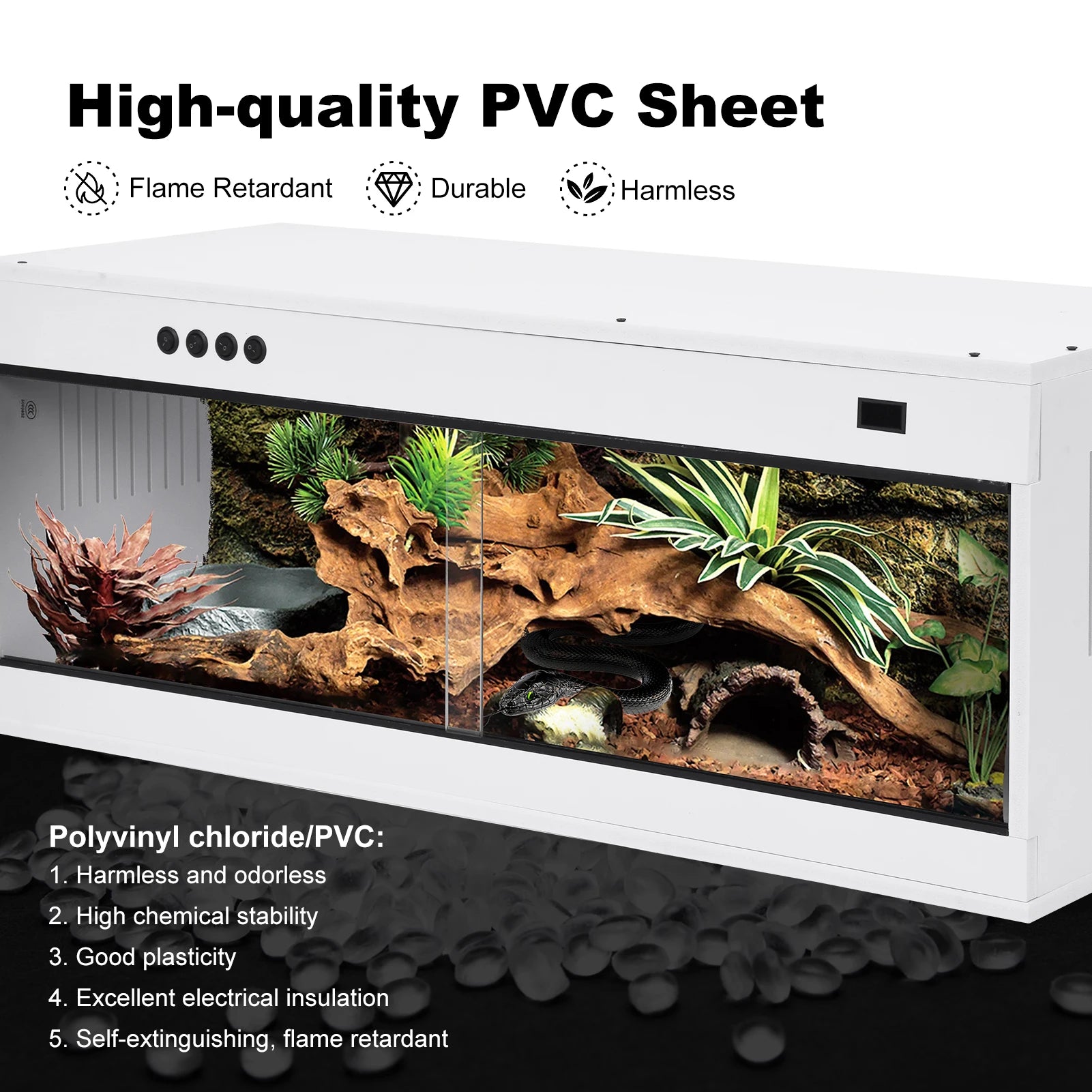 - A generous 100x40x40 cm (39.37x15.75x15.75 in) footprint provides room for climbing, digging, and enrichment, ideal for all reptile species and adaptable to varied heat and humidity zones.