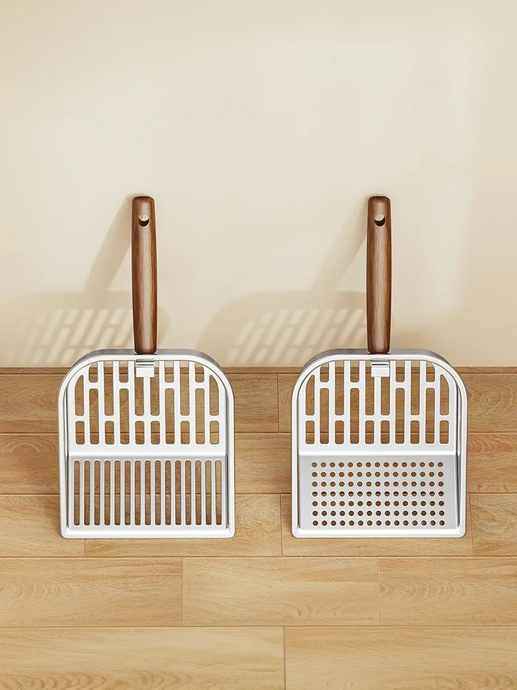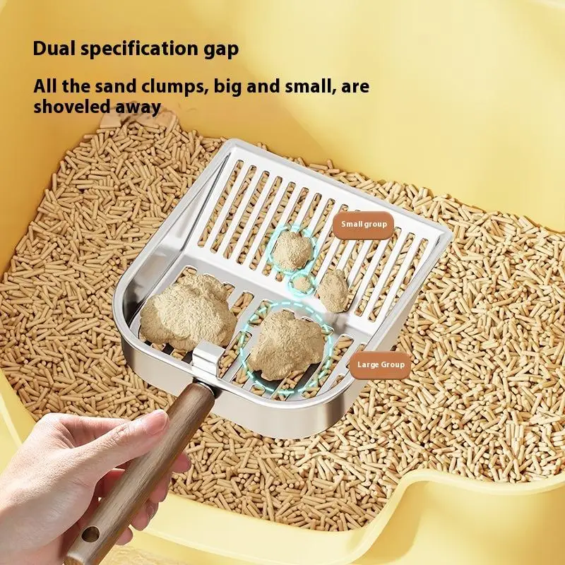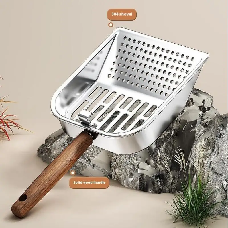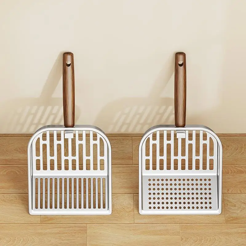 2. Long wooden handle design: The long wooden handle design provided by the cat litter shovel allows users to clean the cat litter without bending over, reducing the burden on the body. Also, wooden handles are generally more comfortable to the touch than plastic handles.
