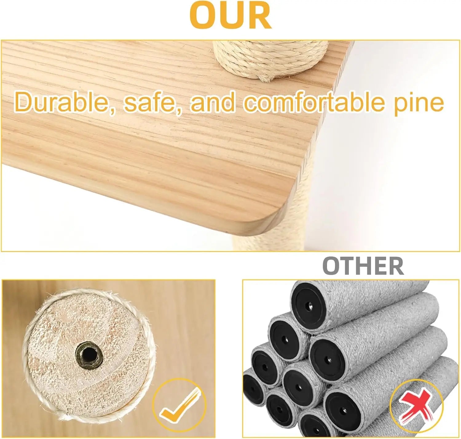 Transform your home into a feline paradise with our comprehensive wall-mounted cat shelves set. This versatile furniture collection is designed to provide endless entertainment and comfort for your cat while enhancing your living space. Key Features: - Complete Play Environment: The set includes 1 cozy house for resting, 1 bridge ladder for climbing transitions, 3 durable scratching posts to satisfy natural instincts, and 5 sturdy steps for easy vertical movement. - Space-Saving Design: Mounted on walls to maximize vertical space, this solution is ideal for apartments or homes where floor space is limited, creating a dynamic playground without clutter. - Natural Material Construction: Crafted from high-quality pine wood, ensuring durability and safety. The natural finish is non-toxic and resistant to wear from scratching and climbing. - Enhanced Cat Well-Being: Encourages physical exercise through climbing and jumping, reduces boredom by offering multiple activity options, and provides secure spots for lounging and observation. - Easy Installation: Includes all necessary mounting hardware and clear instructions for straightforward setup on most wall surfaces. Supports weight up to standard pet requirements. - Stylish Home Integration: The neutral wood design blends seamlessly with various decor styles, adding functional elegance while keeping your cat engaged indoors. Benefits: Promotes healthy activity levels, satisfies scratching needs protectively, offers elevated resting areas cats naturally prefer, and creates an enriched environment that can reduce behavioral issues. Perfect for multi-cat households or providing solo pets with stimulating territory. Dimensions & Care: Each component is sized appropriately for average adult cats. Easy to clean with a damp cloth; avoid harsh chemicals to preserve the wood finish. Regular checking of mounts ensures ongoing safety.